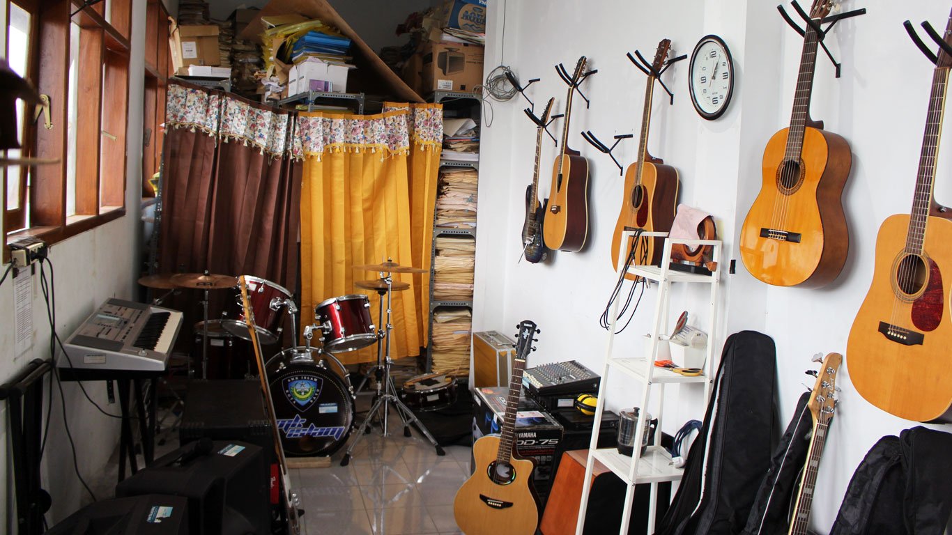 Lab Musik SMK Islam Batu berada di gedung A lantai 4 yang terdiri dari berbagai alat musik seperti gitar akustik, gitar electric, drum set, keyboard, dan lain-lain.