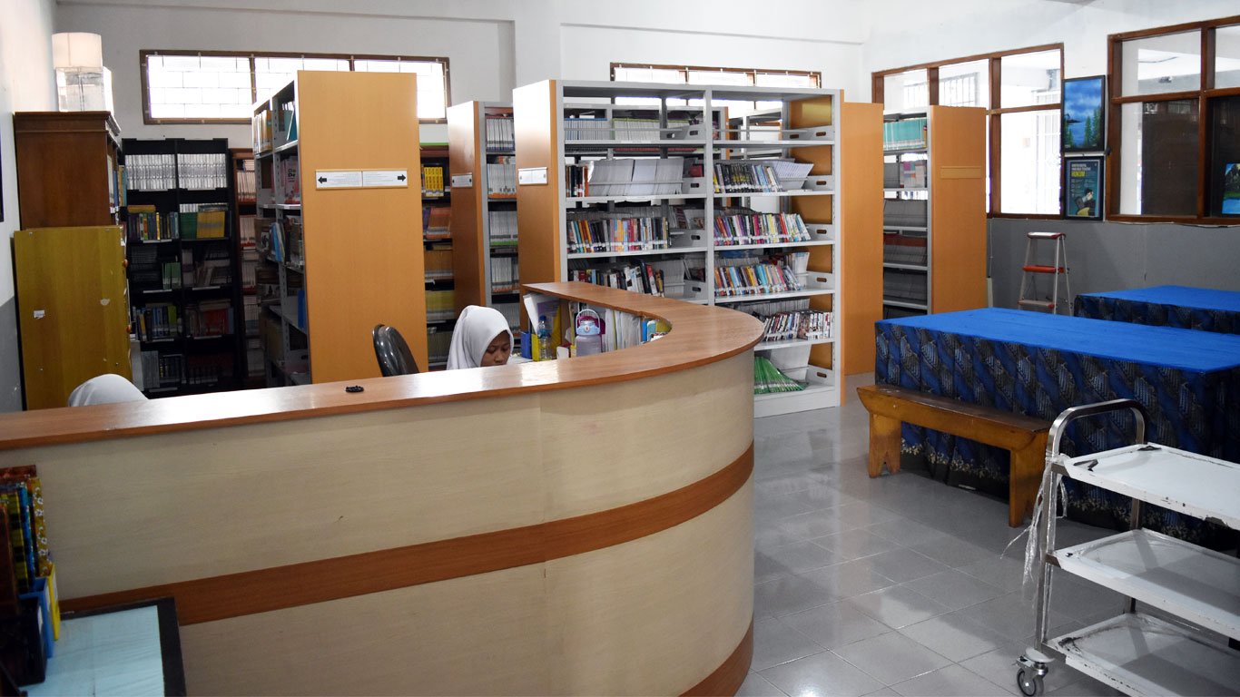 Perpustakaan SMK Islam Batu berada di gedung A lantai 1 dengan menerapkan konsep siswa piket di perpus selama jam pembelajaran aktif.